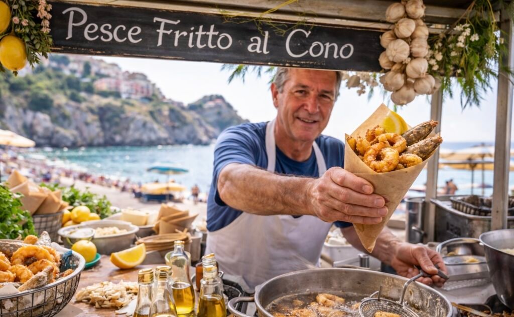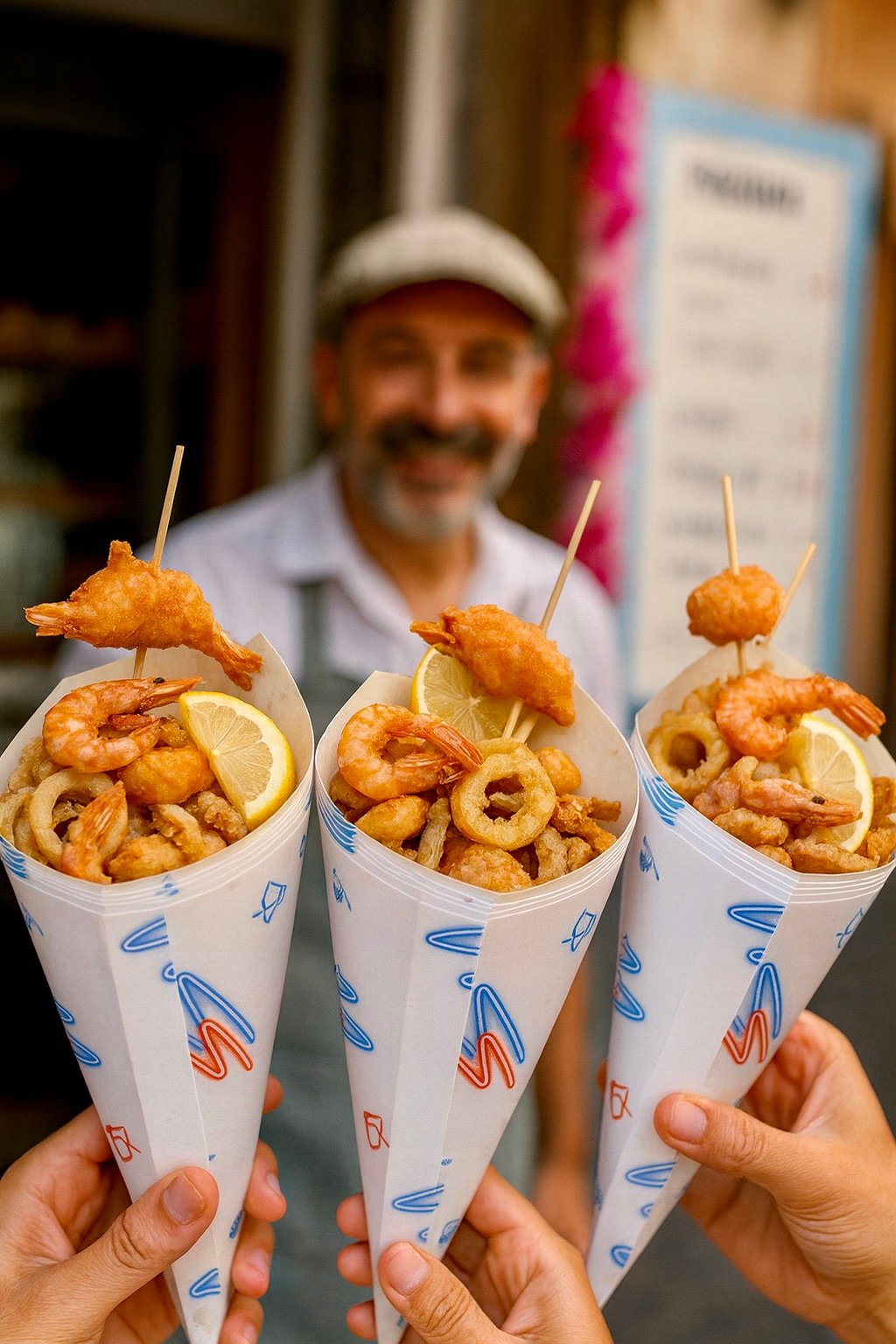 In Italy the seafood isn’t served on a plate — it goes into a simple paper cone called a cuoppo. Along the coast, vendors wrap hot fried seafood in grease-resistant paper so it stays crisp while you walk and eat. The cone absorbs steam and oil, which keeps the coating light and crunchy instead of soggy.