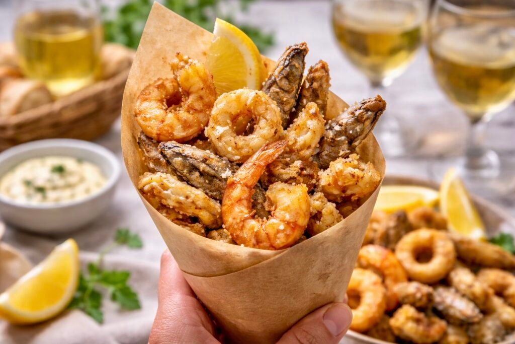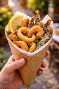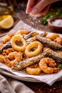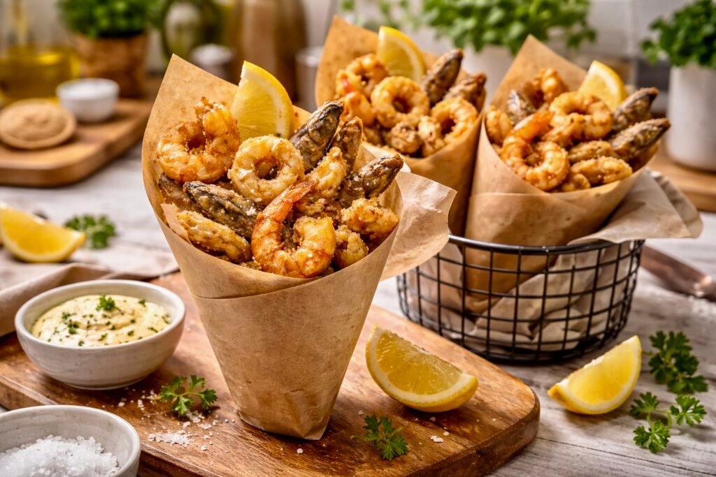 Work in small batches so the oil stays hot, and keep the finished seafood on paper towels only briefly before serving. Do not stack or cover it, or steam will soften the crust. Have your cones, lemon wedges, and salt ready before frying — once cooked, you have a short window where the texture is at its absolute best. Think of it as cooking and serving at the same time, just like a seaside stand in Italy.
