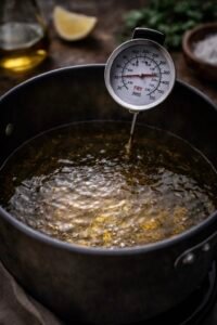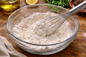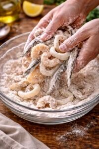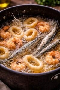 Traditionally, small mixed seafood creates the best texture contrast. Tiny fish such as smelts or whitebait fry almost instantly and become chip-like and crunchy, while shrimp stay juicy and calamari remains tender when cooked quickly. Fresh seafood is ideal, but good-quality thawed frozen seafood works perfectly as long as it is dried very well before dredging. Moisture is the number one cause of soggy coating, so take the extra minute to pat everything completely dry.