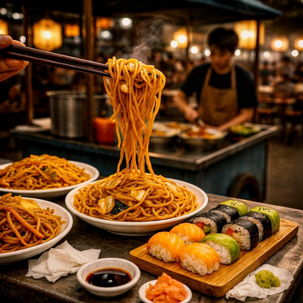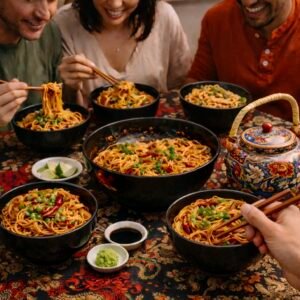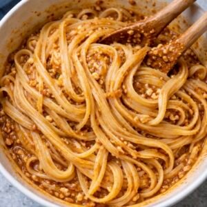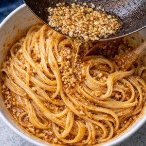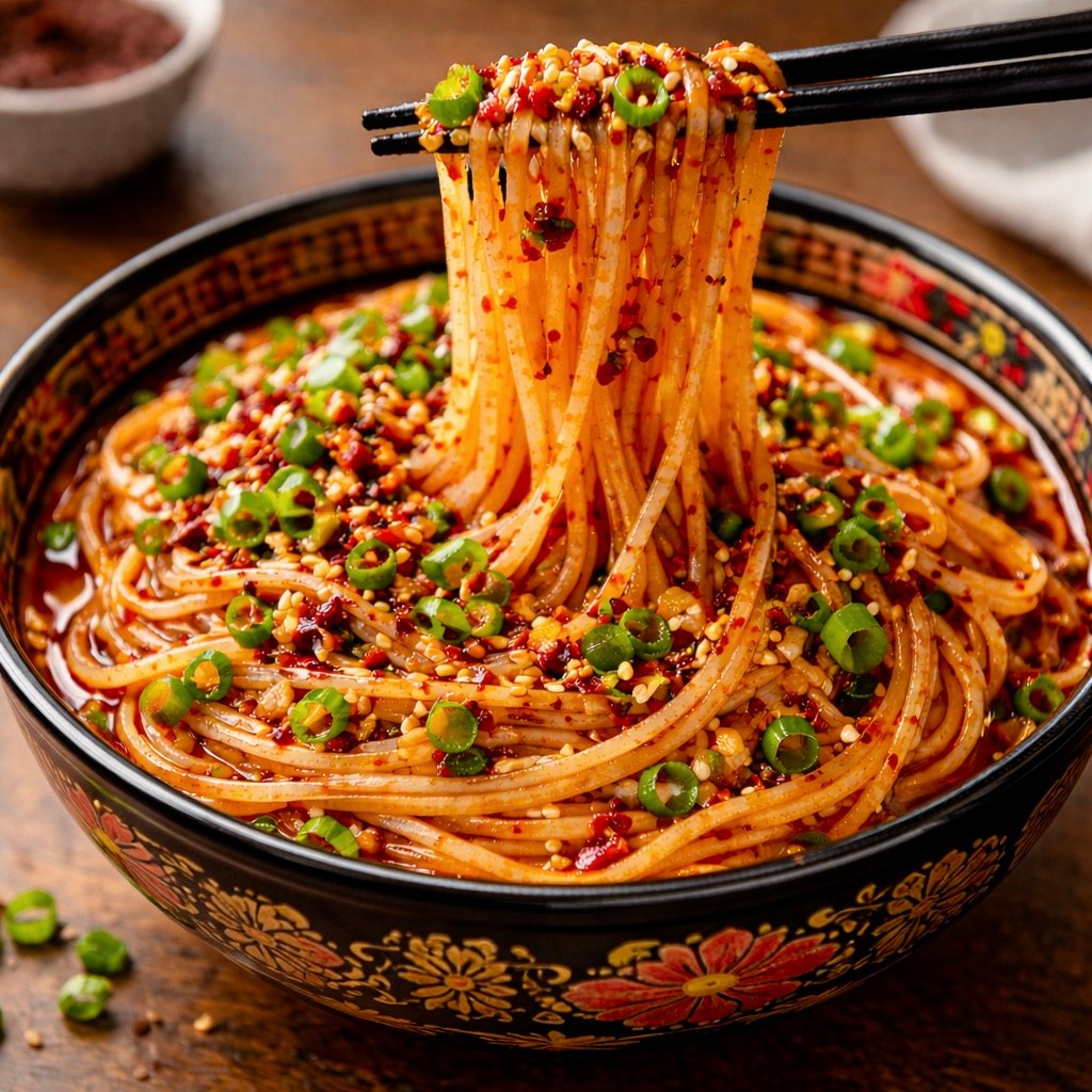 Taiwanese spicy noodles are a beloved night-market street food, known for their bold chili heat, garlicky aroma, and deeply savory, slightly tangy sauce that clings to every strand. You’ll find versions of these noodles all over Taiwan, often served simply in a bowl, tossed quickly to order, and eaten standing at a bustling stall late into the evening. At home, they make an incredibly impressive yet effortless dish — the kind that feels exciting and restaurant-worthy but comes together in minutes. Serve them with crisp cucumber salad, sautéed bok choy, or simple steamed greens to balance the heat, and add iced jasmine tea, oolong, or a light lager on the side. Whether you’re cooking for guests or treating yourself, these noodles deliver big flavor, comforting warmth, and that unmistakable street-food magic that always gets people asking for the recipe.