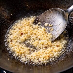 1. Heat 2 tablespoons neutral oil in a small pan over medium heat. Add minced garlic and cook 30–45 seconds, just until fragrant (do not brown).