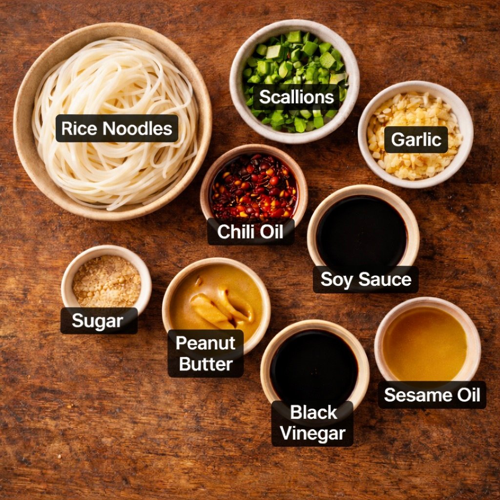 To make Taiwanese spicy noodles at home, you’ll need a short list of bold, pantry-friendly ingredients that are easy to find once you know where to look. The base is rice noodles (thin rice sticks, rice linguini, or fresh rice noodles), tossed with chili oil, soy sauce, black vinegar, sesame oil, a touch of sugar, garlic, and scallions; many versions also include peanut butter or Chinese sesame paste for body and richness. Most of these ingredients are available at well-stocked grocery stores, but for the best flavor and variety, Asian markets are ideal—especially for chili oil, black vinegar, and fresh noodles. As for noodles, there’s plenty of room to customize: use thin rice noodles for a light, slippery texture, rice linguini or rice spaghetti for a heartier bite, fresh wheat noodles for a more traditional street-stall feel, or even egg noodles if that’s what you have on hand. Each variation changes the texture slightly, but the spicy, garlicky sauce ties it all together beautifully. You can refer the list below.