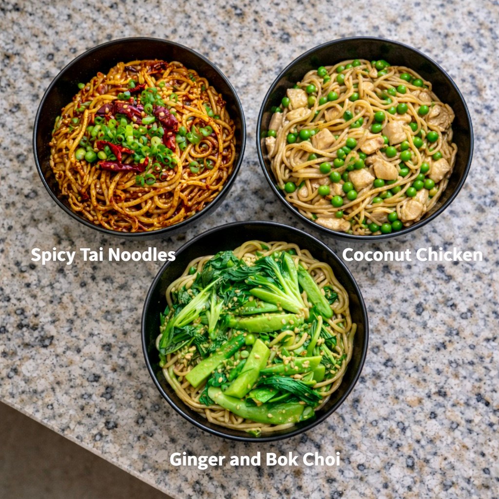 The foundation of the dish. Thin rice noodles, rice linguini, or rice spaghetti all work well, soaking up the spicy sauce while staying light and slippery.